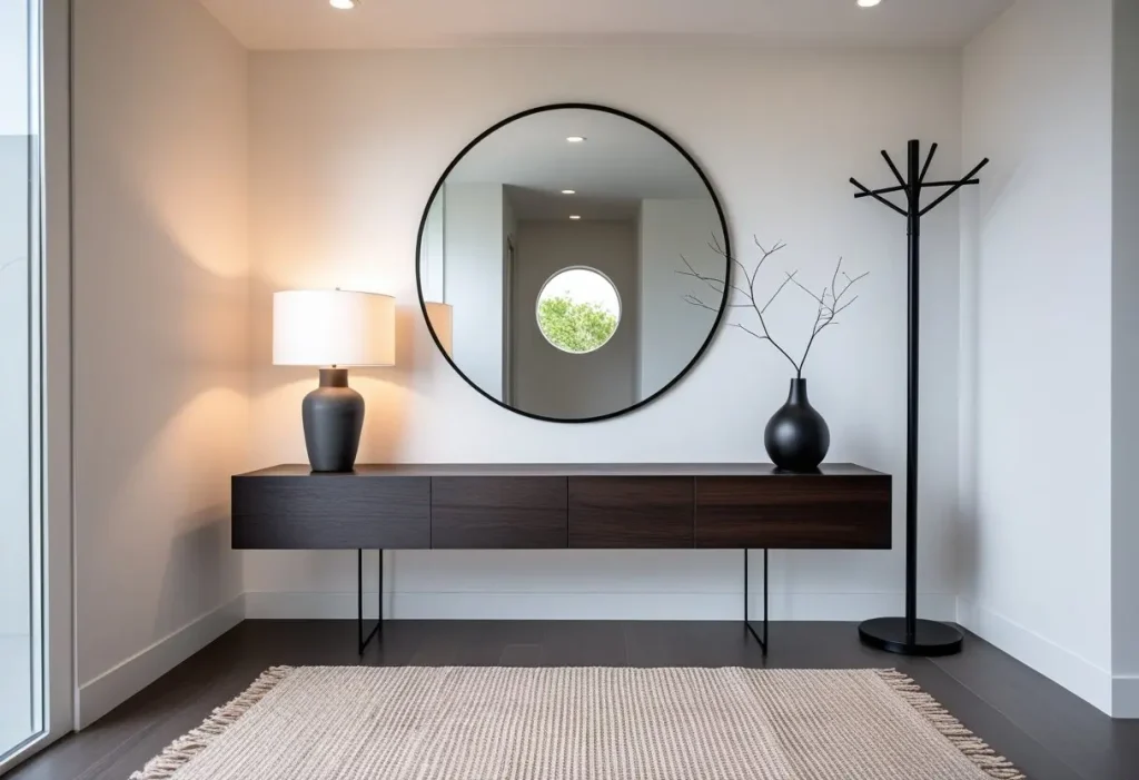 Make a strong first impression with a contemporary home decor entryway that mixes wood, metal, and ceramic textures.