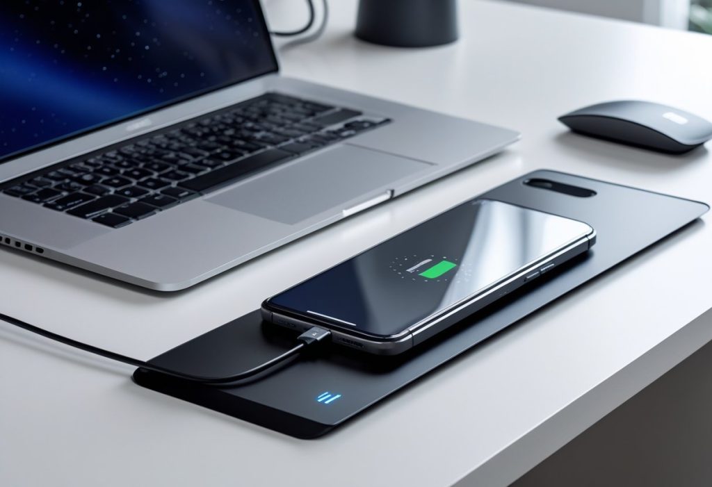 - Charging: A wireless charging pad built into the desk or sitting on its surface eliminates the need for specific charging cables for phones and earbuds.
