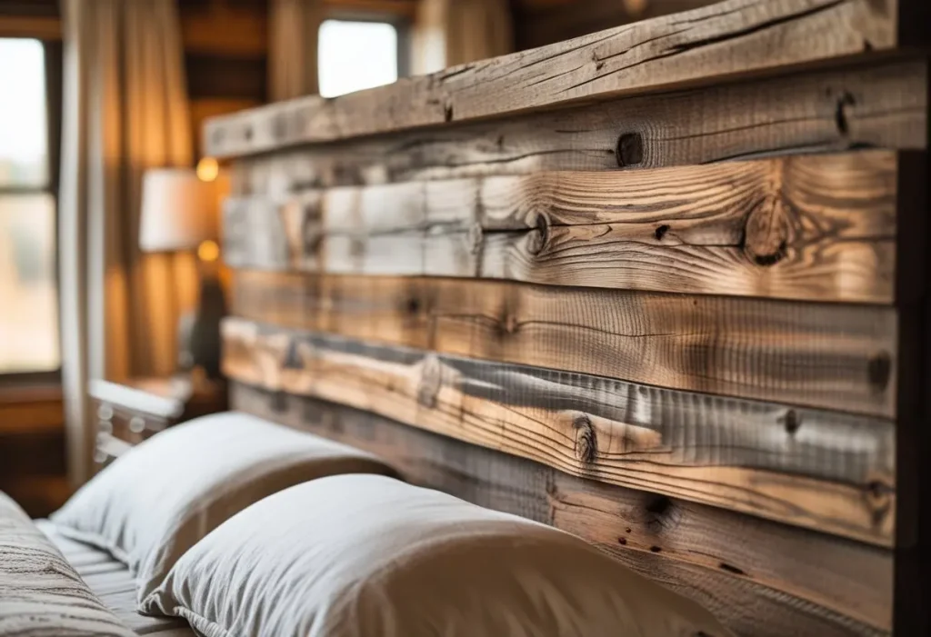 Rustic reclaimed wood headboard highlighting natural grain and craftsmanship.